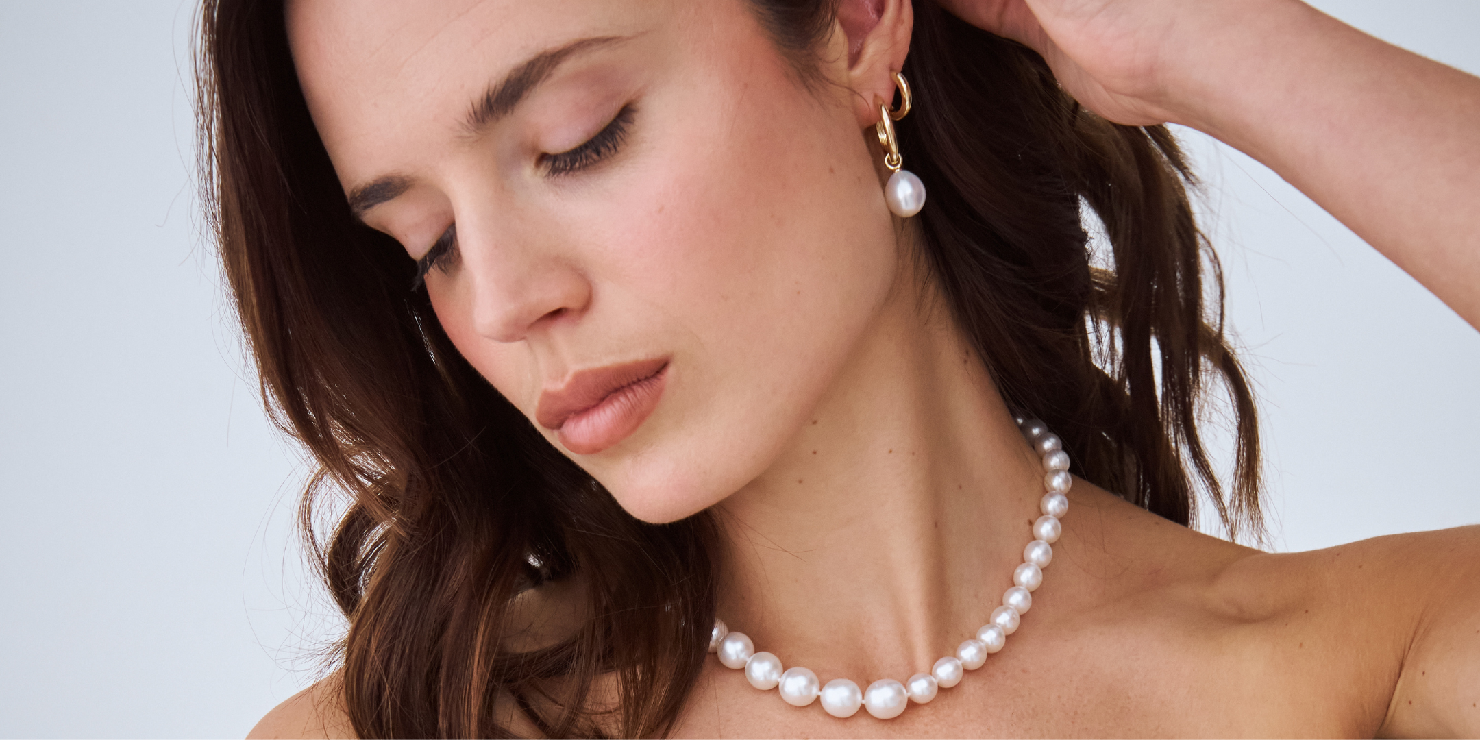 Pearl necklace on a gold chain against a beige background